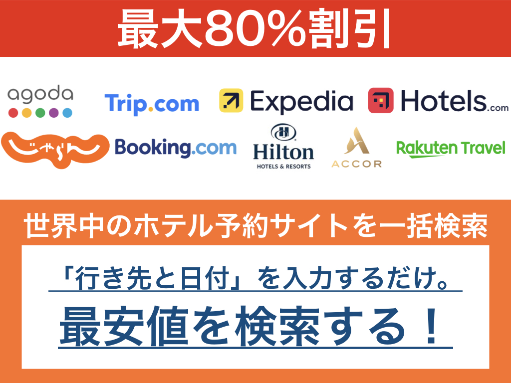 世界中のホテル予約サイトを一括検索できます!だからご希望ホテルの最安値(最大80%OFF)が簡単にわかります。さらにプラス全国旅行支援!キャンセル無料で後払いもできますので早めに予約しても安心です。